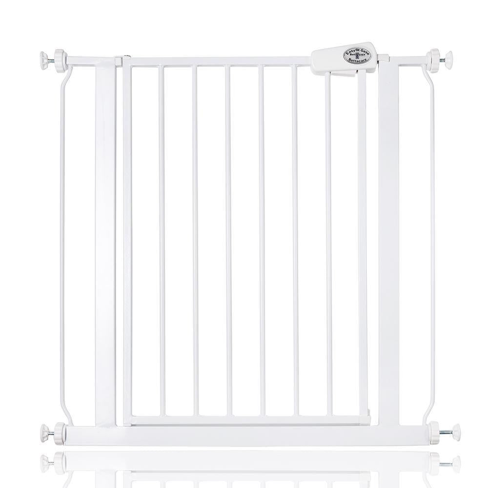The Bettacare Easifit Gate White features a patented double locking handle mechanism and a pinch-free hinge for added safety. Its childproof locking handwheel prevents over-tightening and ensures the gate stays secure. The gate fits openings of 75-83cm, with extensions available for wider spaces.