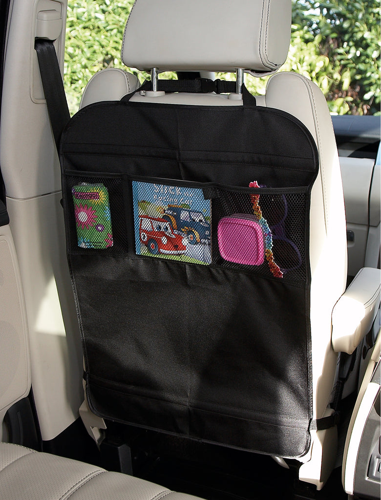The Clippasafe Seat Back Scuff Protector provides protection for the back of the car seat from scuffs and footprints, and includes convenient storage pockets. Installation is easy around both the headrest and car seat.