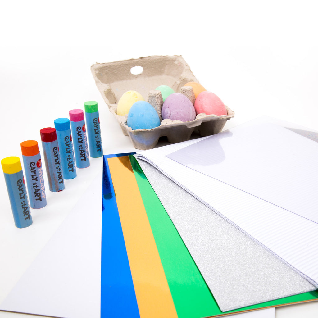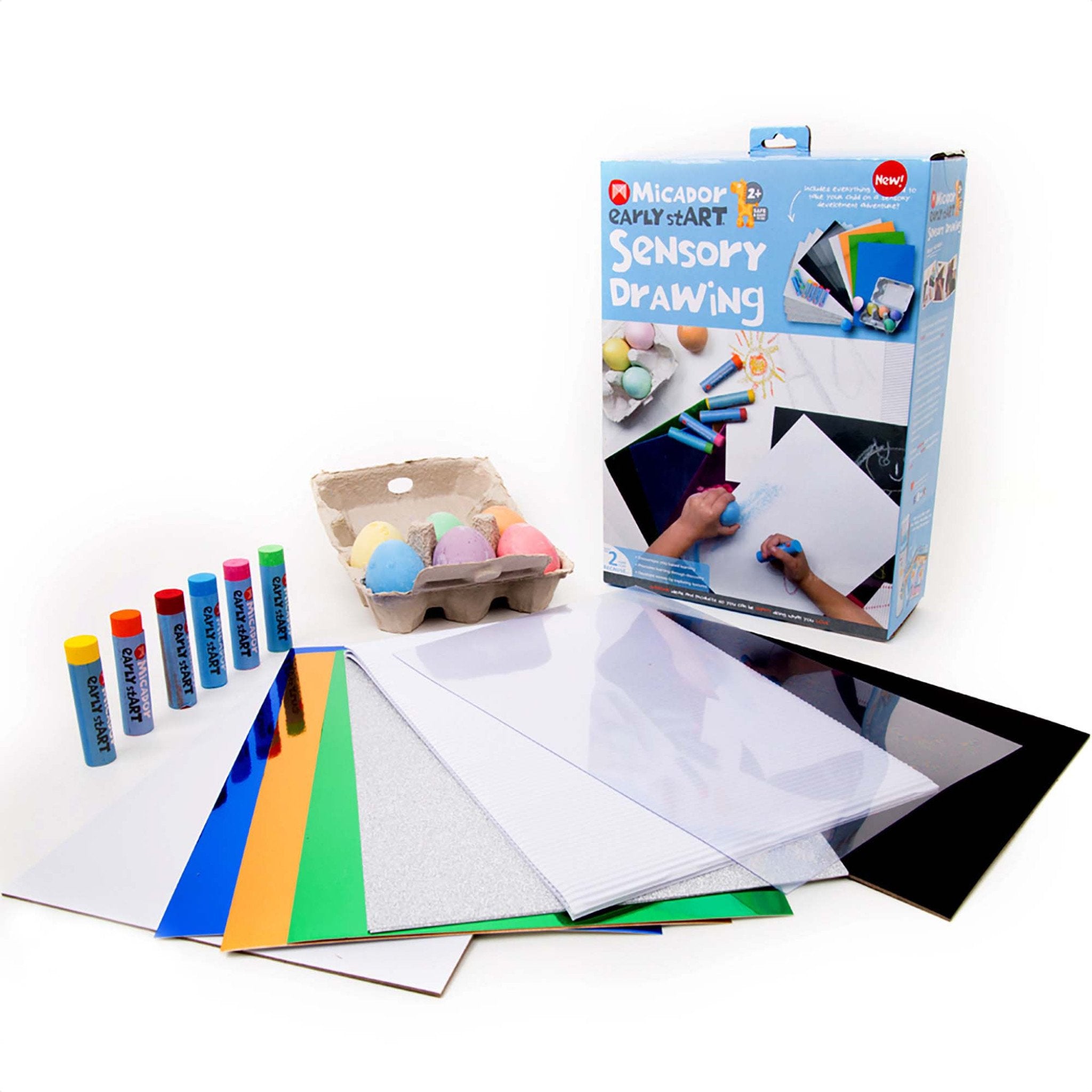 The Micador Early StART Sensory Drawing Pack is a comprehensive set designed to stimulate sensory development in young children while promoting imaginative play. This pack includes everything needed to engage kids in a sensory exploration adventure. It comes with 6 Softies Tri-Grip Crayons and 6 egg chalks, which are designed for easy grip and fine motor development. The pack also features 12 different textured pieces of card, offering tactile variety that helps with sensory exploration.