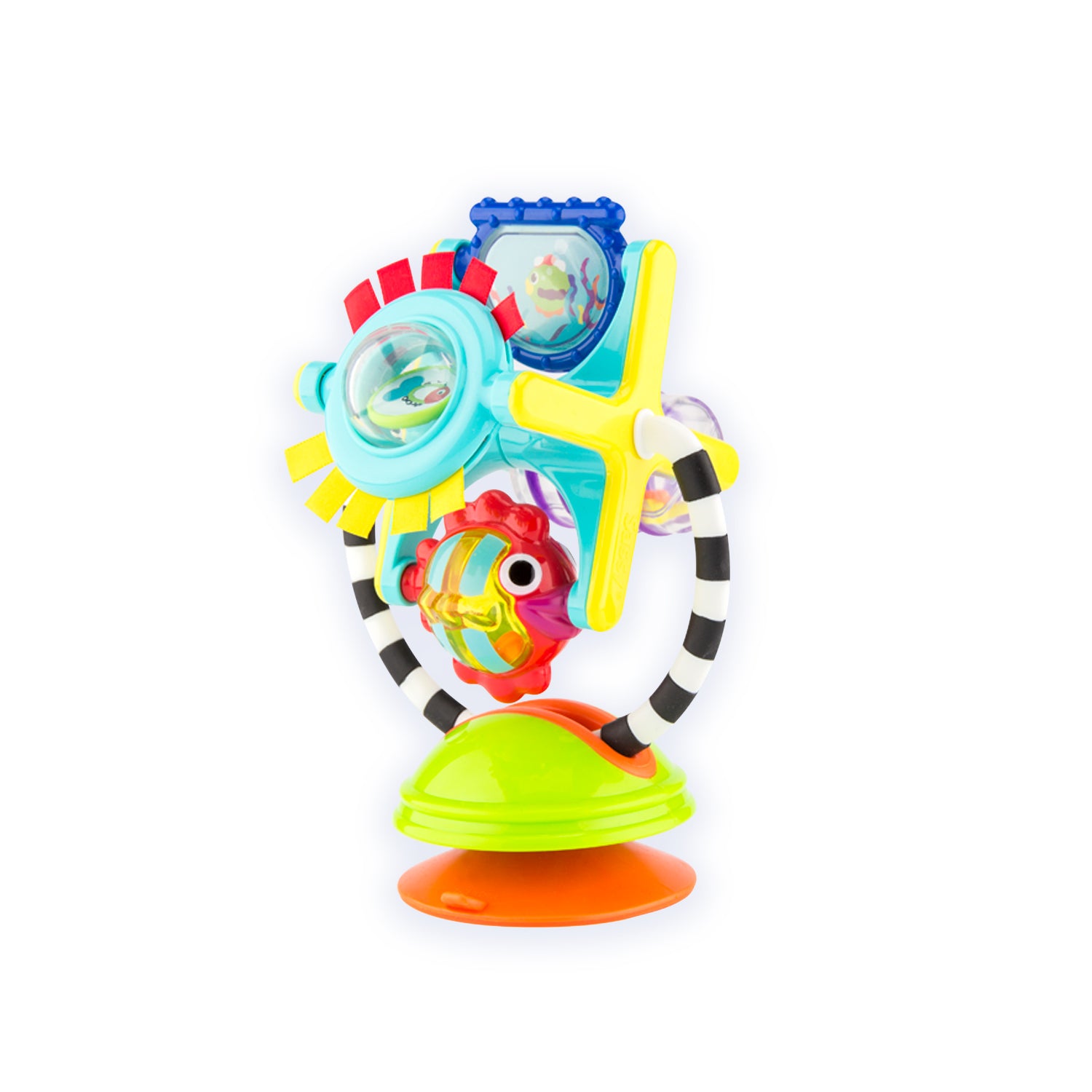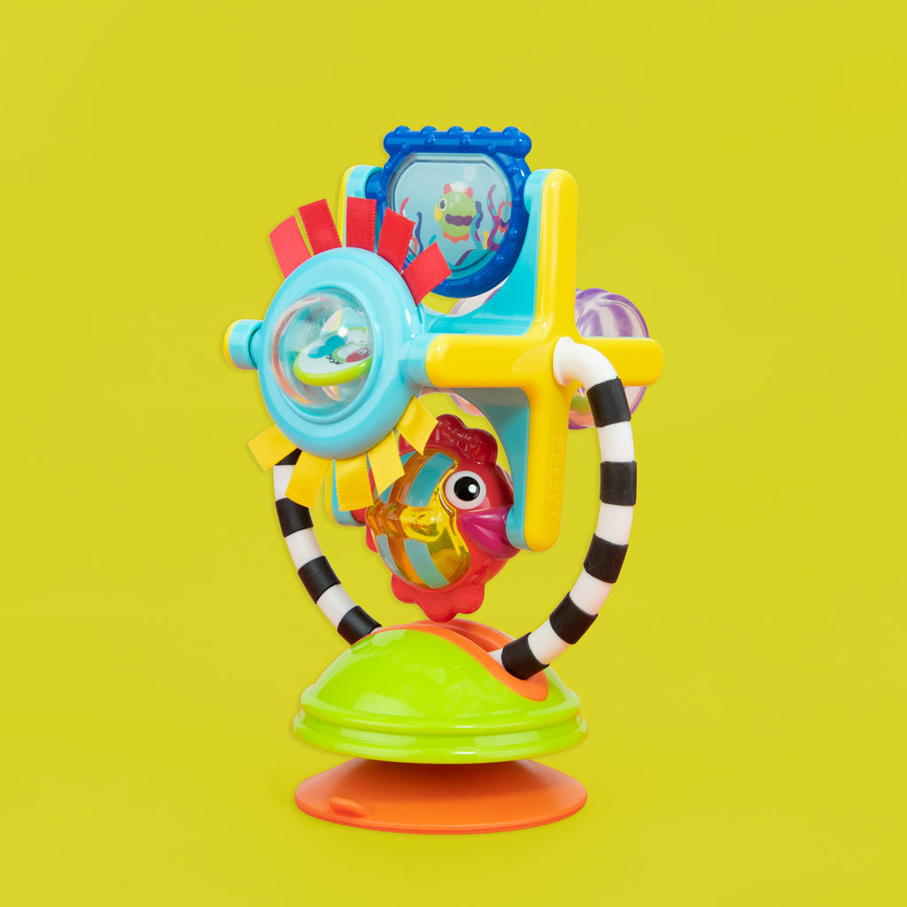 Use the suction cup base to attach the station to a flat surface and watch baby explore the many features of the Sassy Fishy Fascination Station. The spinning wheel encourages baby to reach, tug and bat, strengthening hand-eye coordination. Each feature on the wheel spins individually when baby bats at it, introducing baby to cause & effect. The colorful beads trapped within the clear structures allow baby to connect the sound to sight. The toy’s handle is multi-textured, perfect for mouthing. This 2-in-1 toy can be suctioned to a table or high chair tray, or removed from the base for floor play.