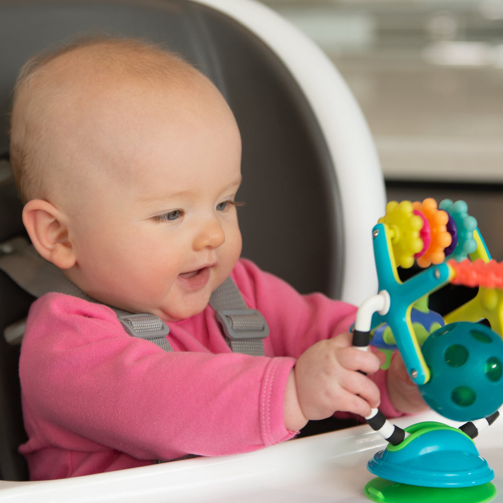 The Sassy Teethe & Twirl Sensation Station stimulates baby’s sense of touch and teaches them to recognise new objects with the different materials and surfaces on this station. The soft surfaces encourage mouthing, aiding in the development of communication skills. The spinning ferris wheel provides a higher level of visual tracking and encourages baby to reach, tug and bat, strengthening hand-eye coordination. This 2-in-1 toy can be suctioned to a table or high chair tray, or removed from the base for floor play.