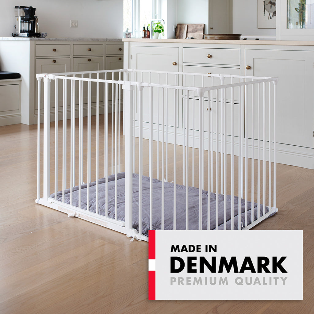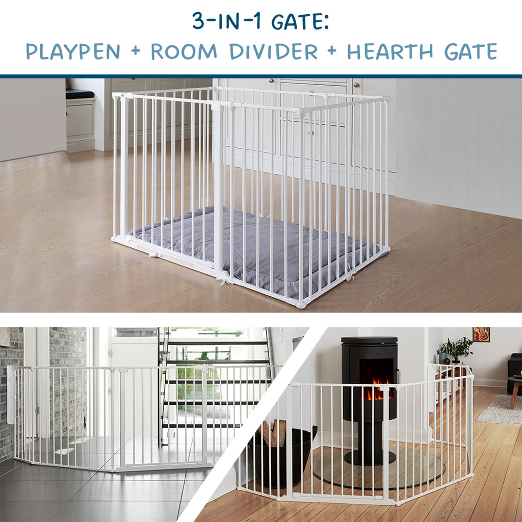 Once your child no longer needs the playpen, you can convert it into a versatile safety gate with the use of wall brackets (sold separately). This gate is suitable for various locations such as around a fireplace, wide or irregular doorways, staircases, or as a room divider. Additionally, you have the option to extend the gate by purchasing additional small and large sections separately.