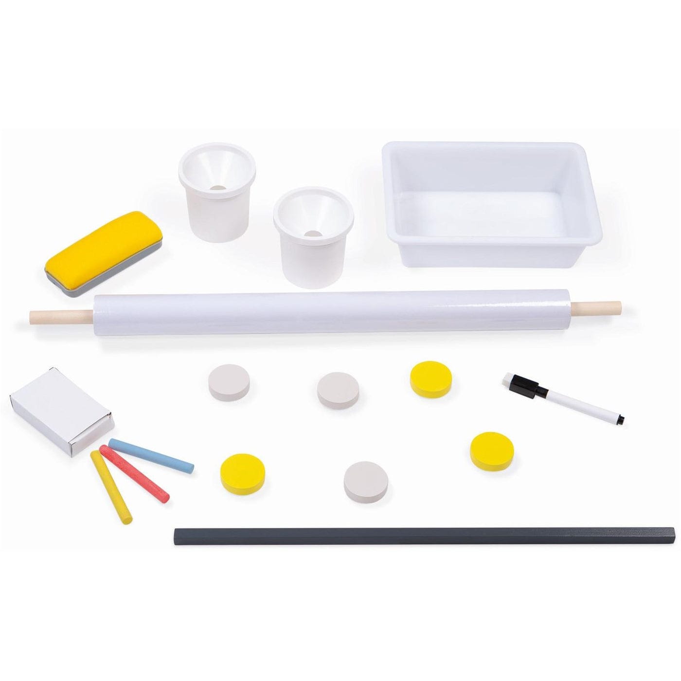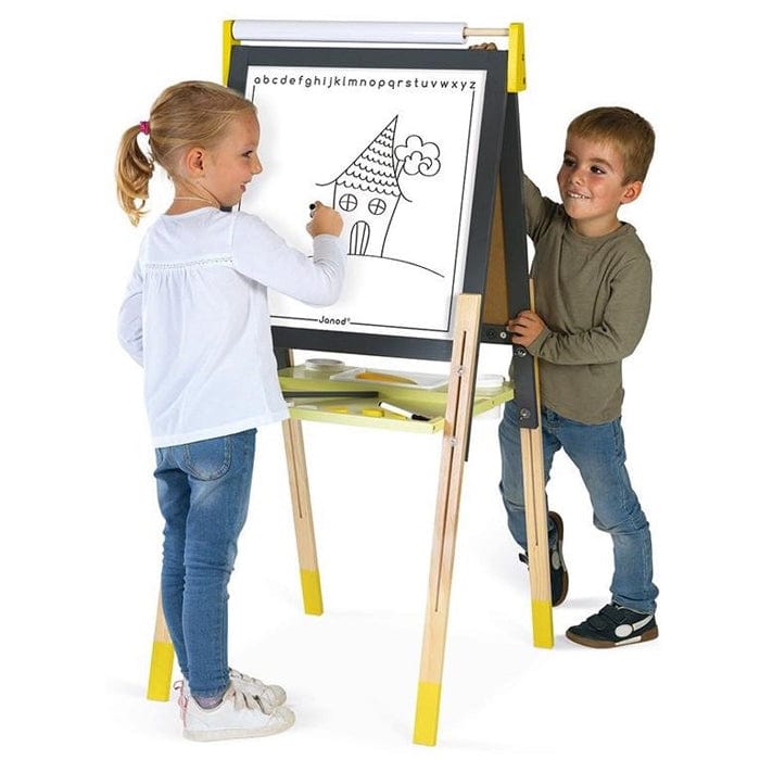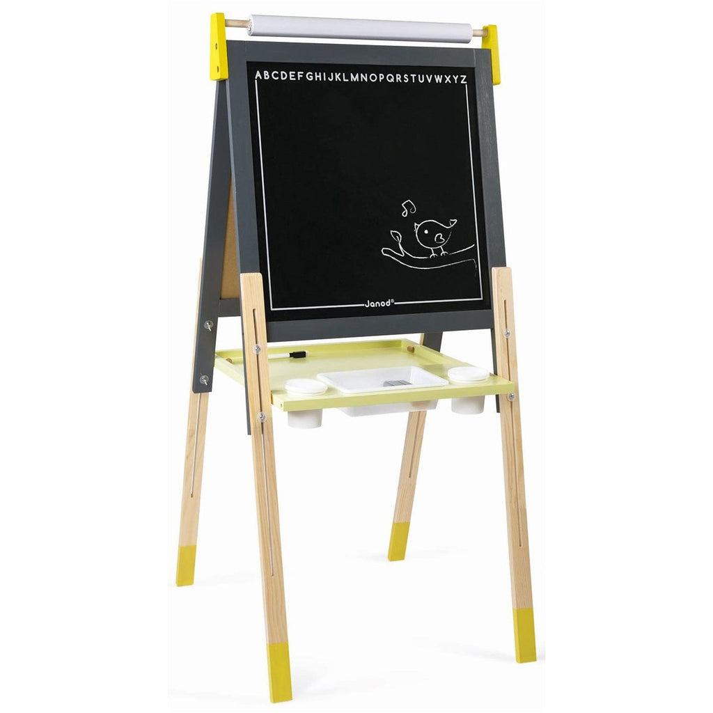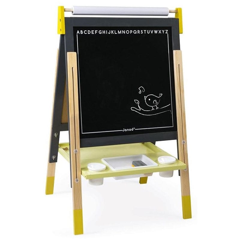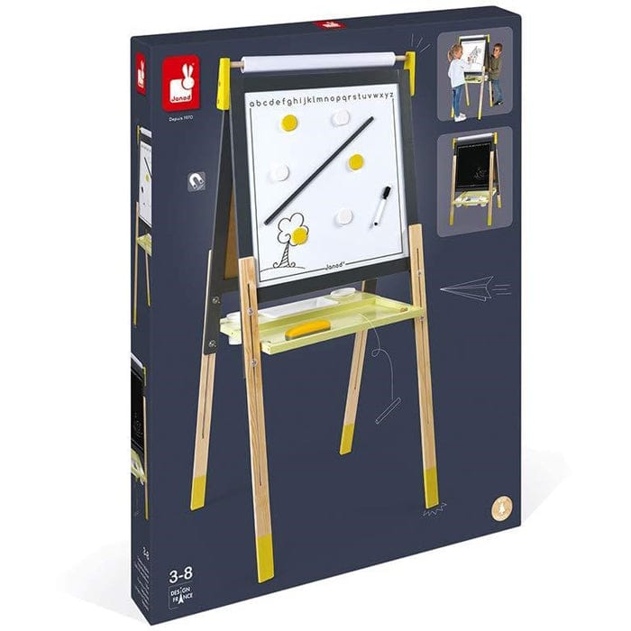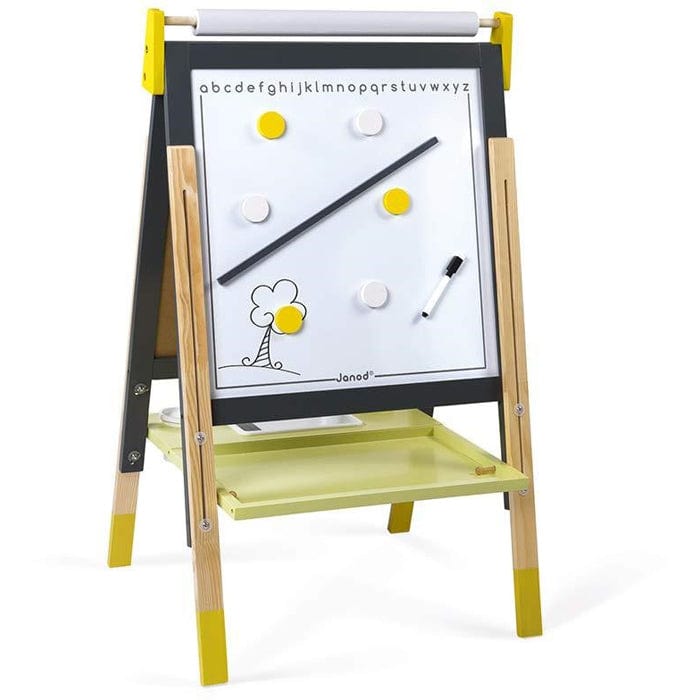 U Janod Siva/žuta ploča je prekrasan praktični drveni dvostrani easel. S jedne strane sadrži magnetsku ploču za markere za brisane markere, a s druge ploče. EASEL dolazi s nekoliko dodataka, uključujući 6 magneta, 10 komada krede, 1 suhi marker za uklanjanje, 1 kolut papira, 1 gumicu za gumicu i 1 magnetski ravnalo. Visina se može podesiti dok vaše dijete uzgaja cijele nabore ploče za jednostavno skladištenje.