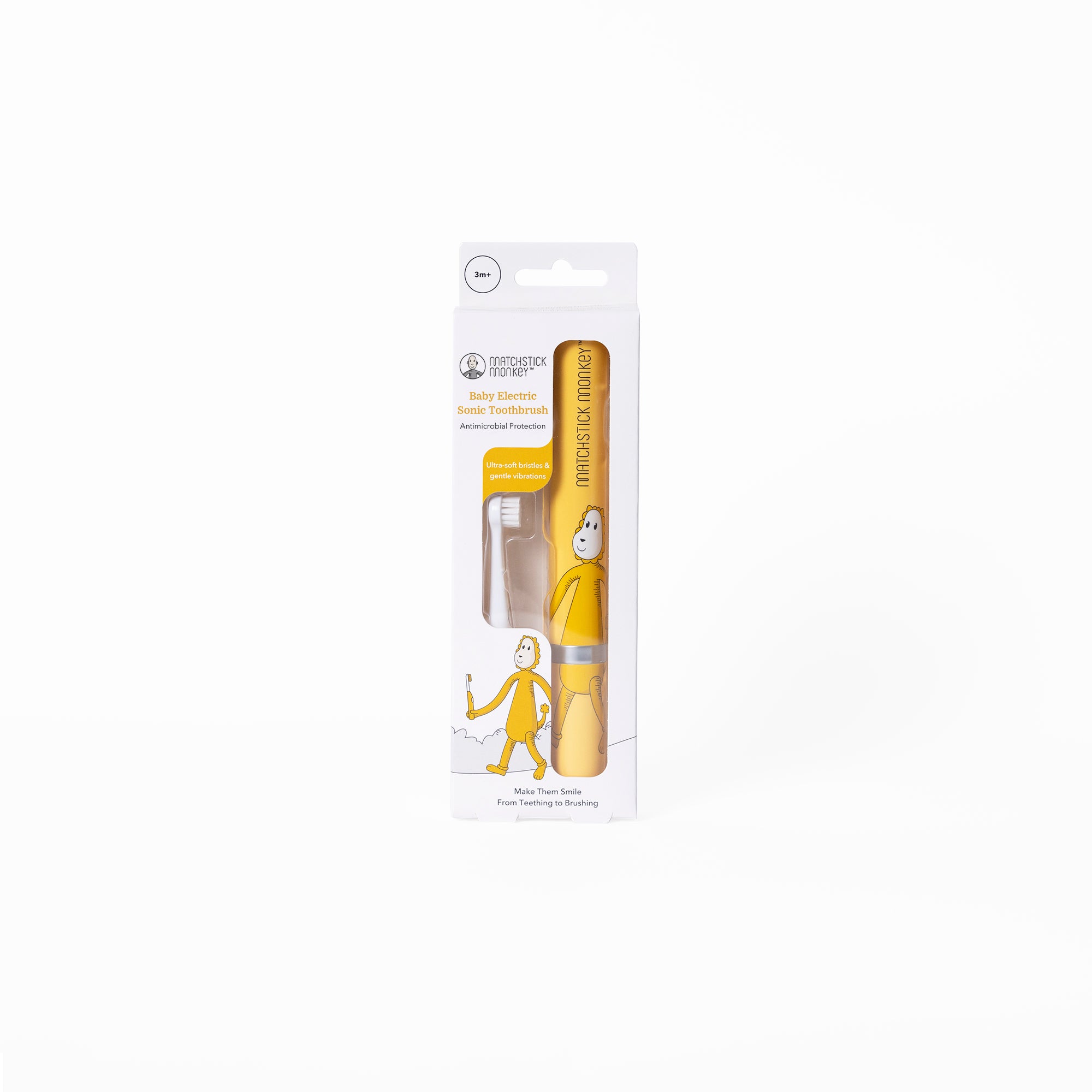 The Matchstick Monkey Baby Electric Sonic Toothbrush is powered by batteries, has undergone safety testing, and includes a standard AAA battery that can be replaced. It features a baby-sized brush head suitable for ages 3-36 months, with replacement heads available for separate purchase.