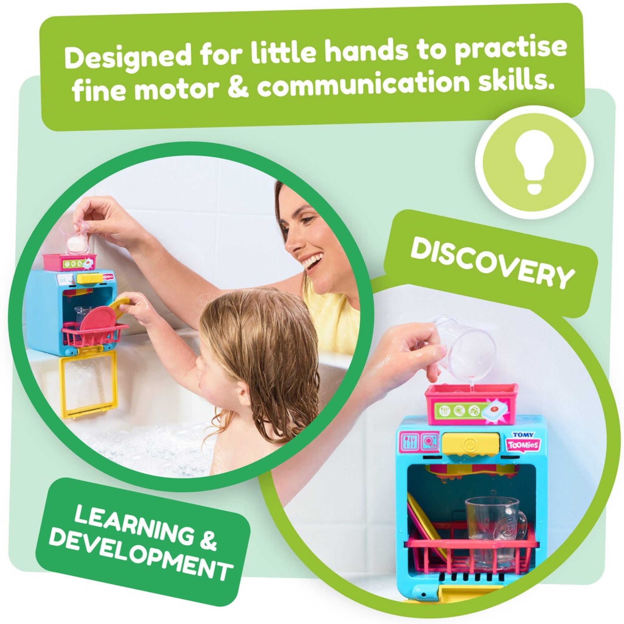 Simply add water to the top, load the dishes, press the button, and watch as the sprayer spins and splashes, 'cleaning' the dishes for endless fun. The suction pads secure the toy to wall tiles, bath sides, or any smooth surface, ensuring stable play. Designed to promote fine motor skills, communication, and an understanding of cause and effect, this dishwasher encourages collaborative play while keeping bath time engaging.