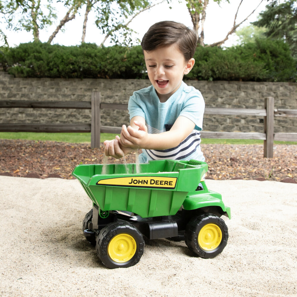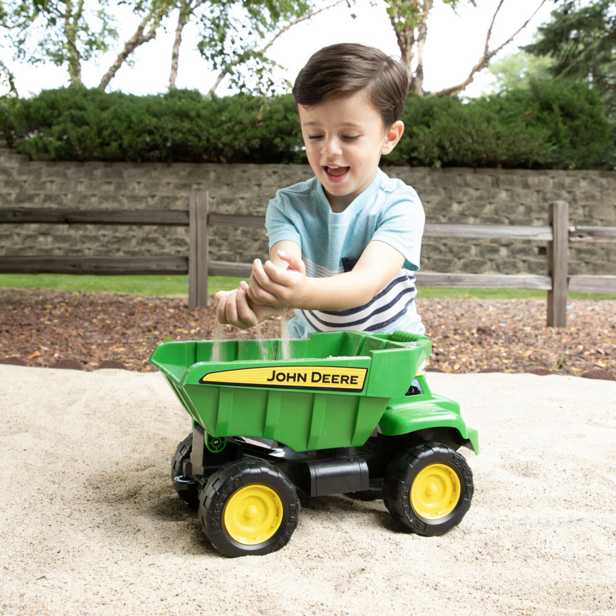 The Tomy John Deere Big Scoop Dump Truck is ideal for both indoor and outdoor play. It features easy tipping action and free-rolling wheels for simple transportation of goods. Made from durable plastic, it's built to withstand tough outdoor fun and is perfect for the sandpit.