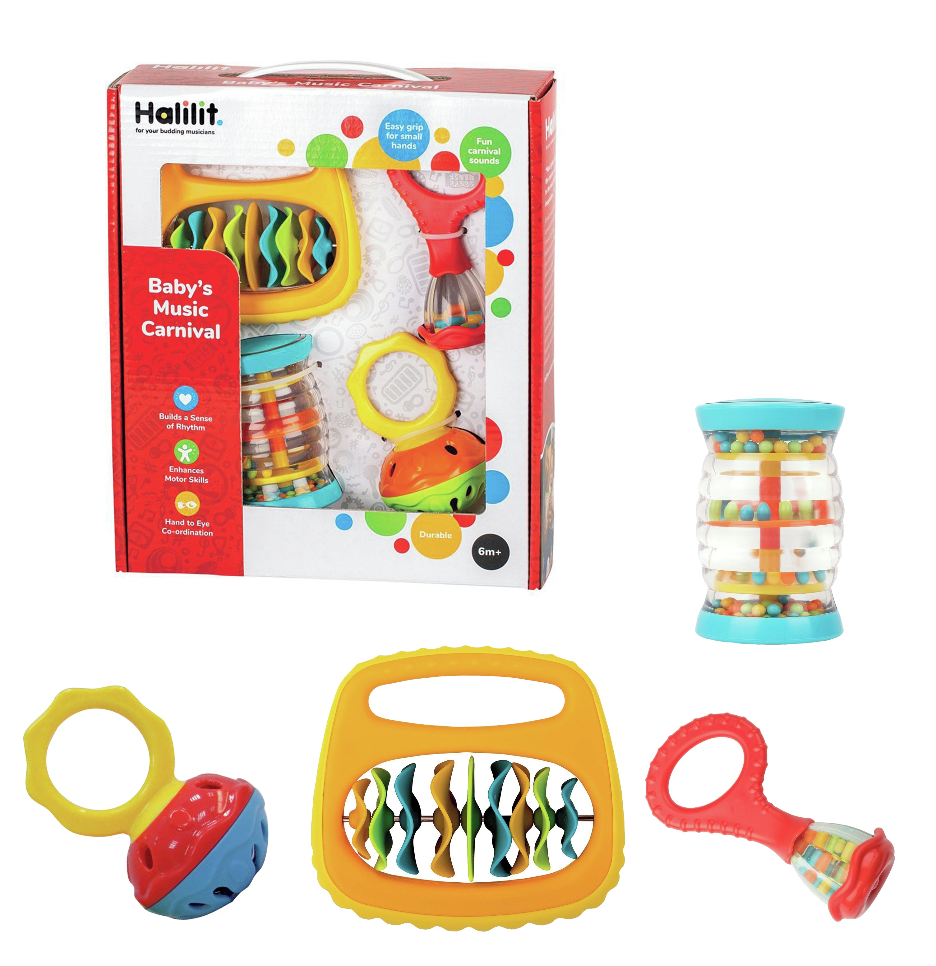 Create your own music carnival with the Halilit Toddler's Music Carnival! This beautifully designed gift set features a Mini Cage Bell, Baby Maraca, Clip Clap, and the bestselling Rainboshaker, making it an ideal introduction to early music-making. Cascading beads produce gorgeous sounds and captivating visual effects that will delight young babies.