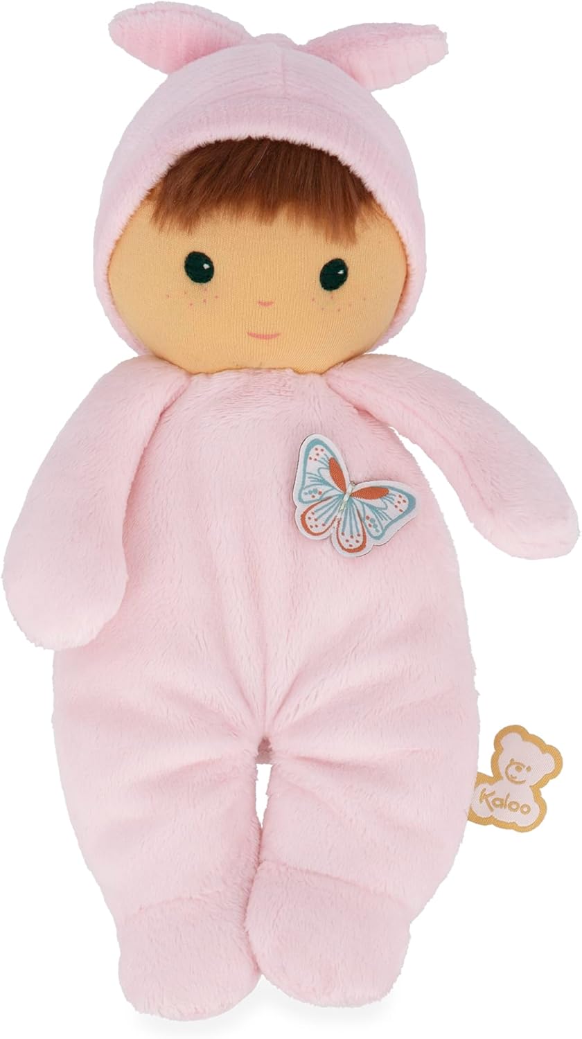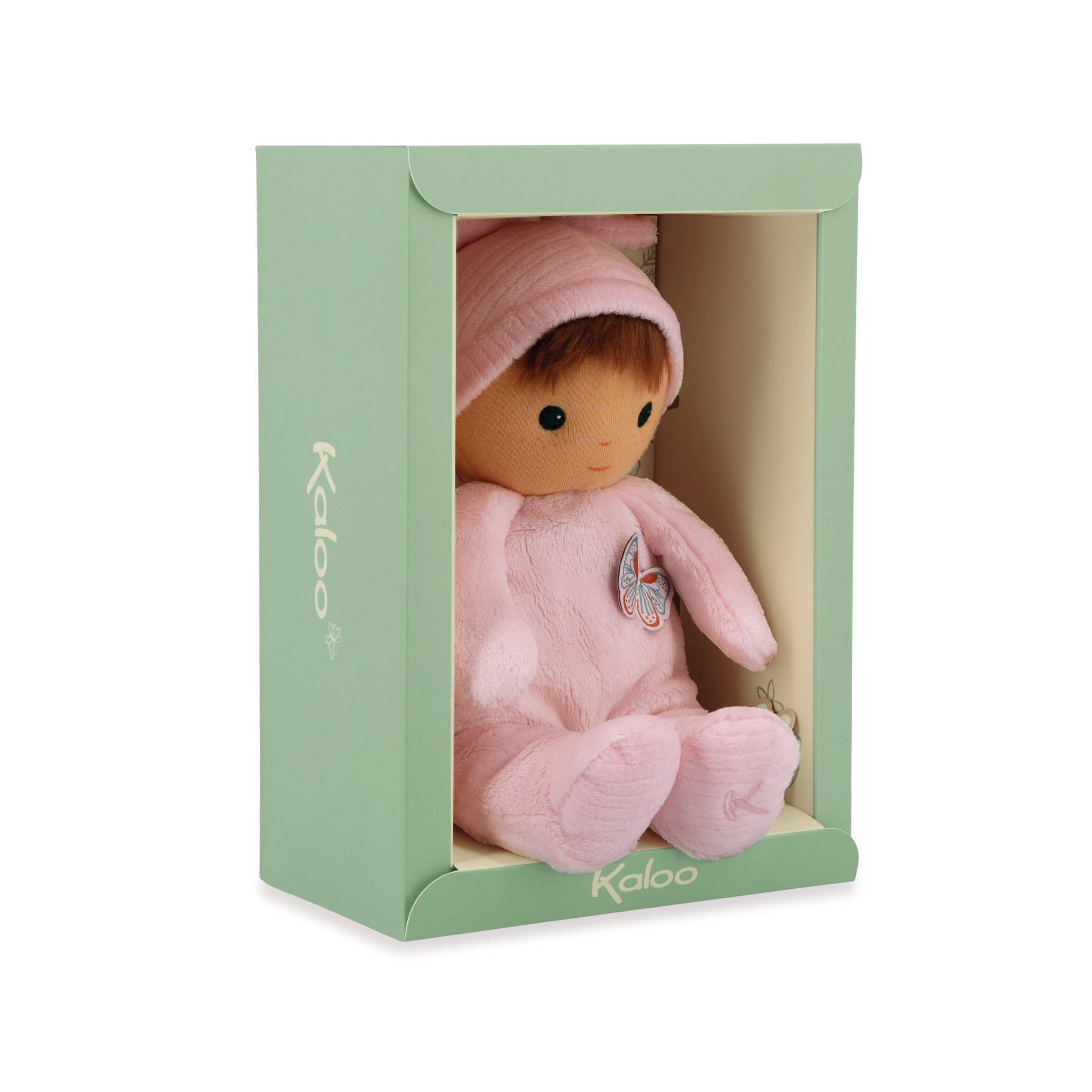 Kaloo Baby Camélia is a charming 24cm fabric doll that serves as a comforting companion or a baby's first doll. This adorable brown doll features pink pyjamas and pretty green eyes. Made from extra-soft micro-velvet and corduroy, and stuffed with recycled polyester, she offers a cosy texture perfect for cuddling. Inspired by the camellia flower, symbolizing affection and resilience, Baby Camélia is an ideal gift to express admiration and harmony. The delicate butterfly decoration adds a poetic touch, while the butterfly-shaped label encourages dexterity and sensory exploration. Each embrace gently stimulates the senses and supports tactile development. The adorable knotted hat invites further exploration. Made with 90% recycled materials, this doll reflects a commitment to environmental sustainability while ensuring quality and safety.