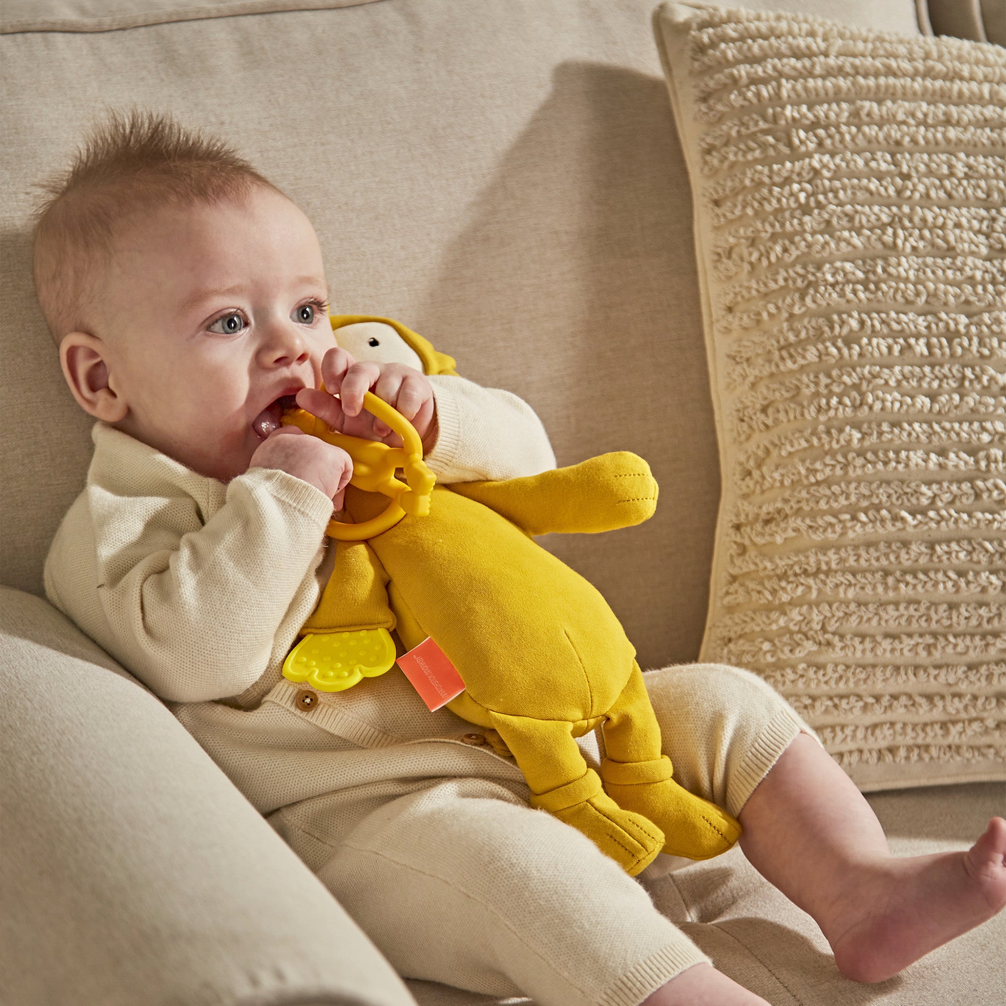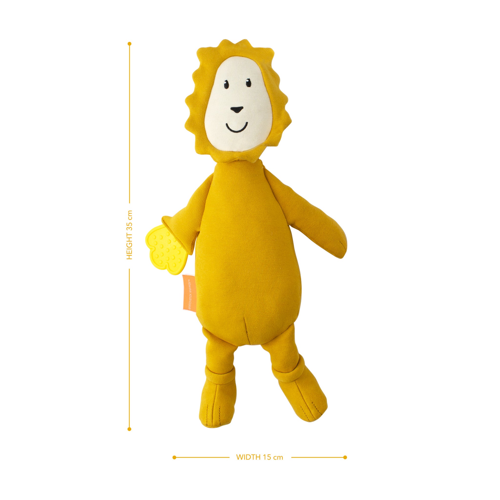 - Plush features a teething hand to soothe sore gums