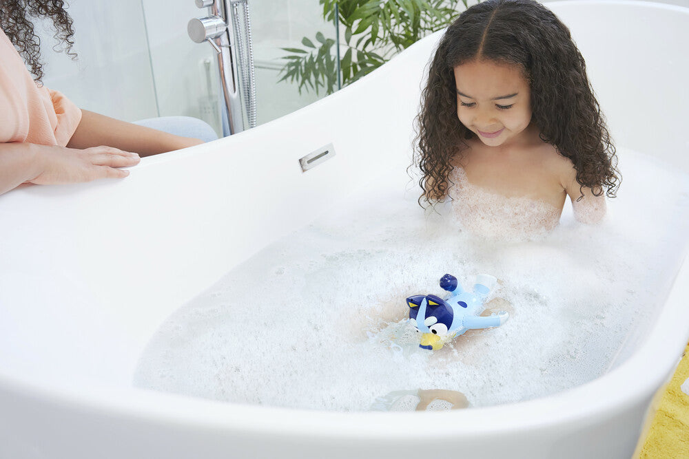 • Join Bluey in the surf at bath time as she goes swimming round and round