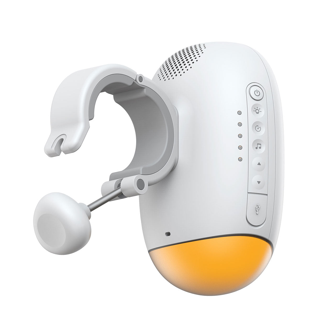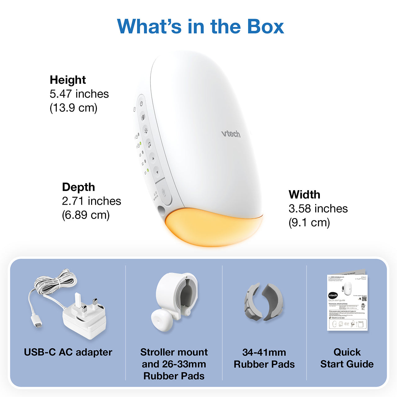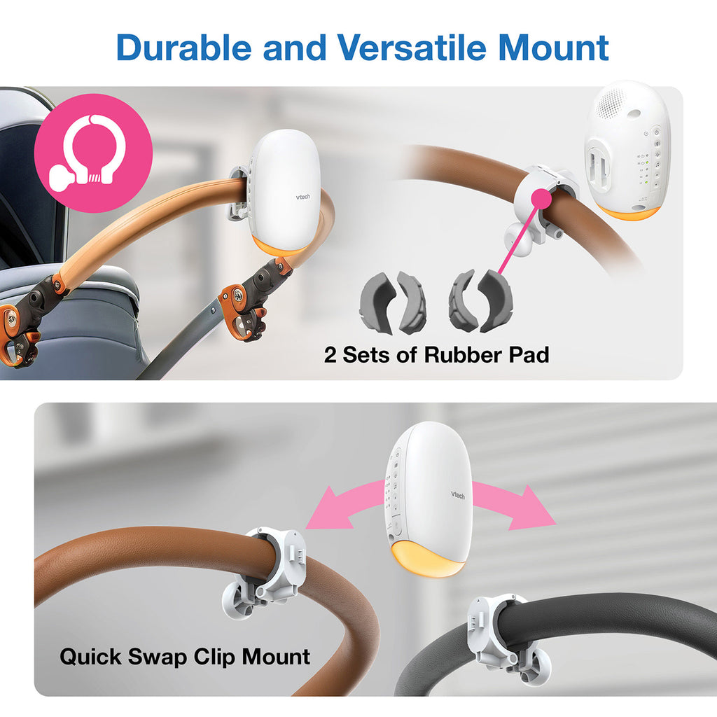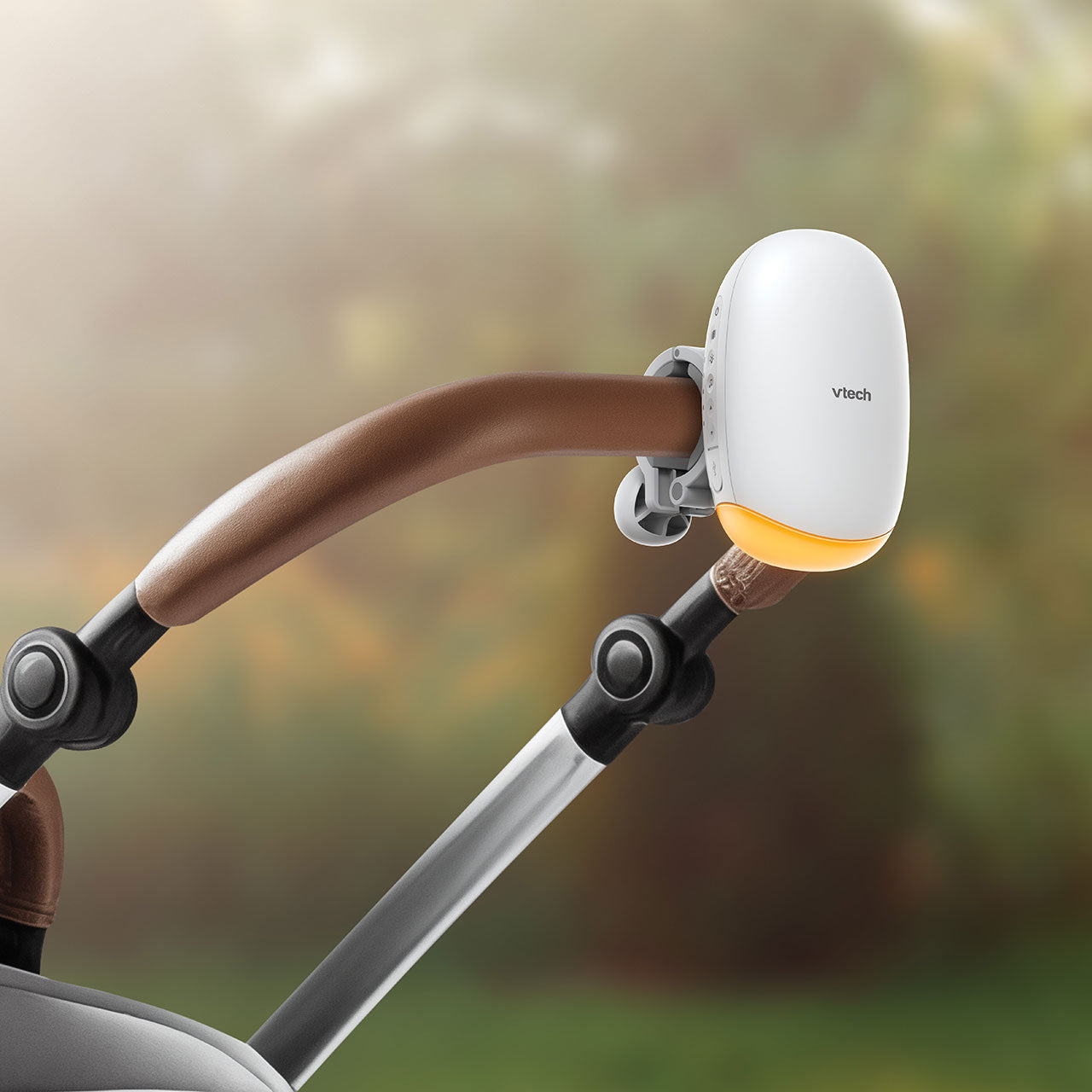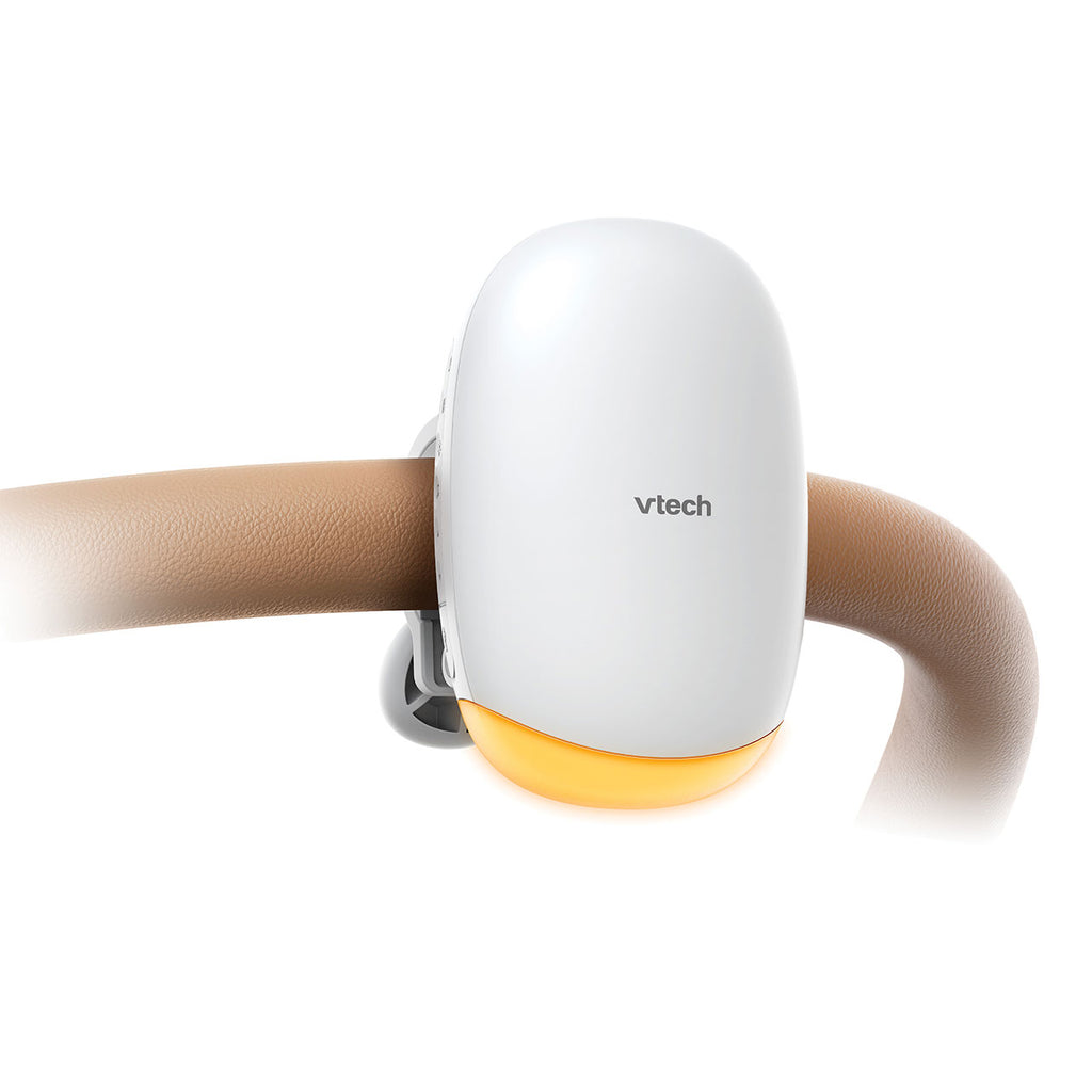 Soothe your baby on the go with the VTech V-Hush Rocker Sound and Motion Stroller Rocker. Designed with a secure, flexible mounting system, it easily attaches to your stroller—two mounts included for quick switching between strollers. The built-in vibration motor gently rocks the stroller, mimicking natural motion to calm your little one. With up to 9 hours of battery life, a soft amber night light, 30- or 60-minute auto-off timer, and IPX2 drip-proof protection, the V-Hush Rocker is your perfect travel companion—rain or shine.