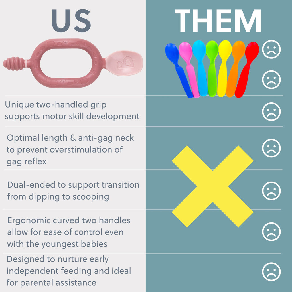 - Spoon end helps babies learn to scoop independently