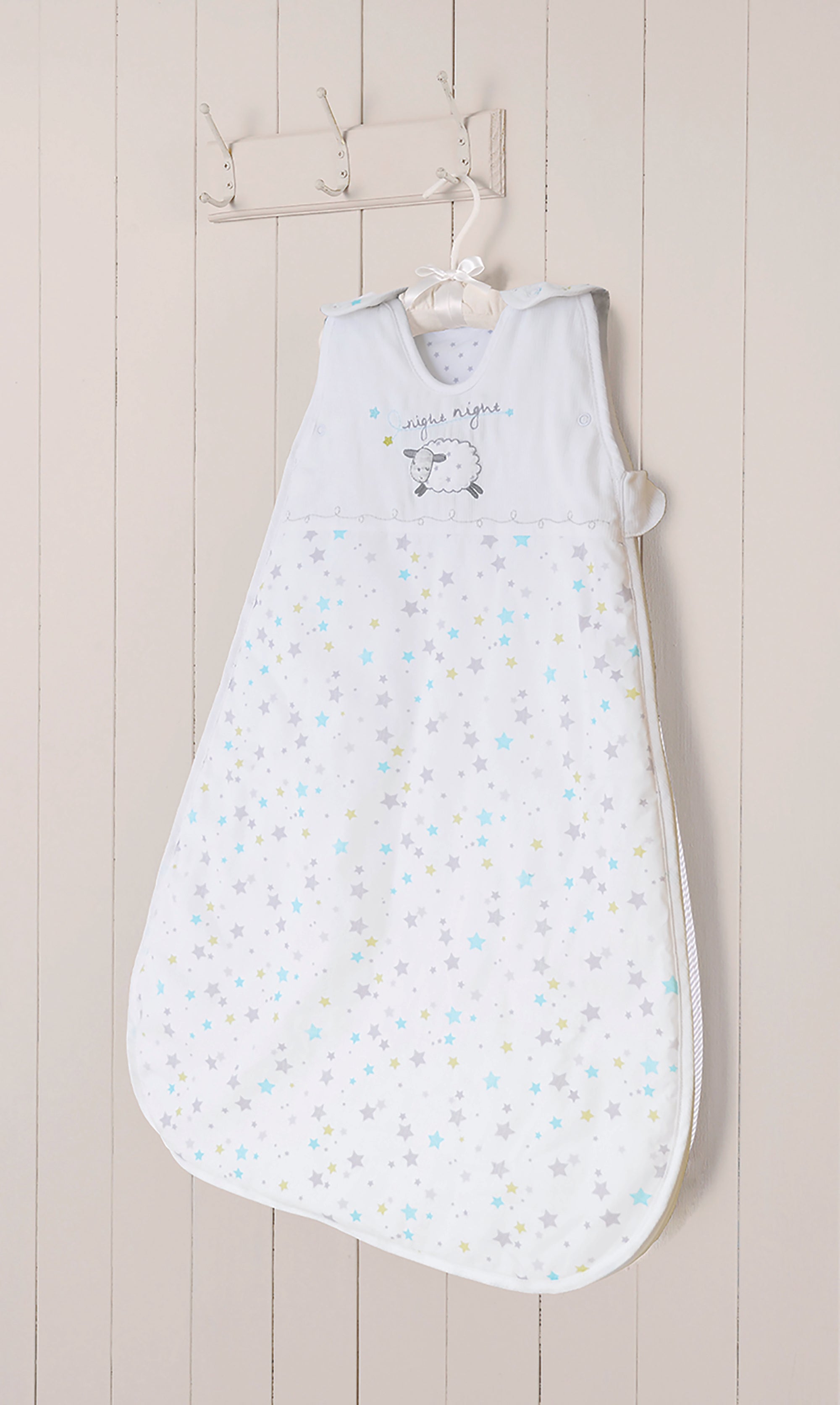 The Silver Cloud Counting Sheep Sleeping Bag, 2.5 Tog for 0-6 months, is made from crisp white cotton with fresh print colors, appliqué, and embroidered details. This super cosy sleeping bag ensures your baby stays warm and snug all night, with a zip design that makes nighttime changes easy.