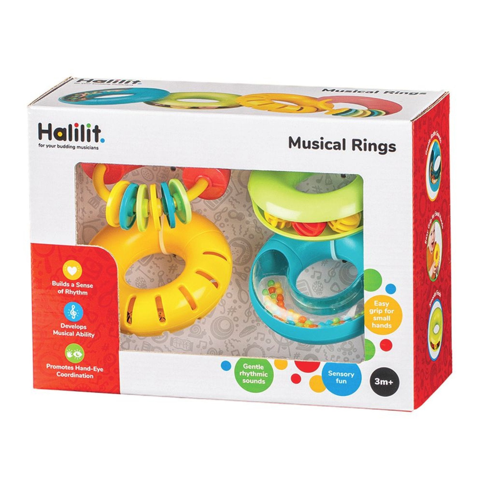 The Halilit Musical Rings are a set of four chunky, colourful rings designed for babies. Each ring produces its own unique sound, including beads, jingles, and rattles. Perfectly sized for little hands, the rings create fascinating sounds and visual effects with gentle movements. These musical instruments help develop creativity, motor skills, hand-eye coordination, and teach cause and effect. Halilit's durable and high-quality toys are trusted in pre-schools and nurseries, ensuring safety and enjoyment for young children.