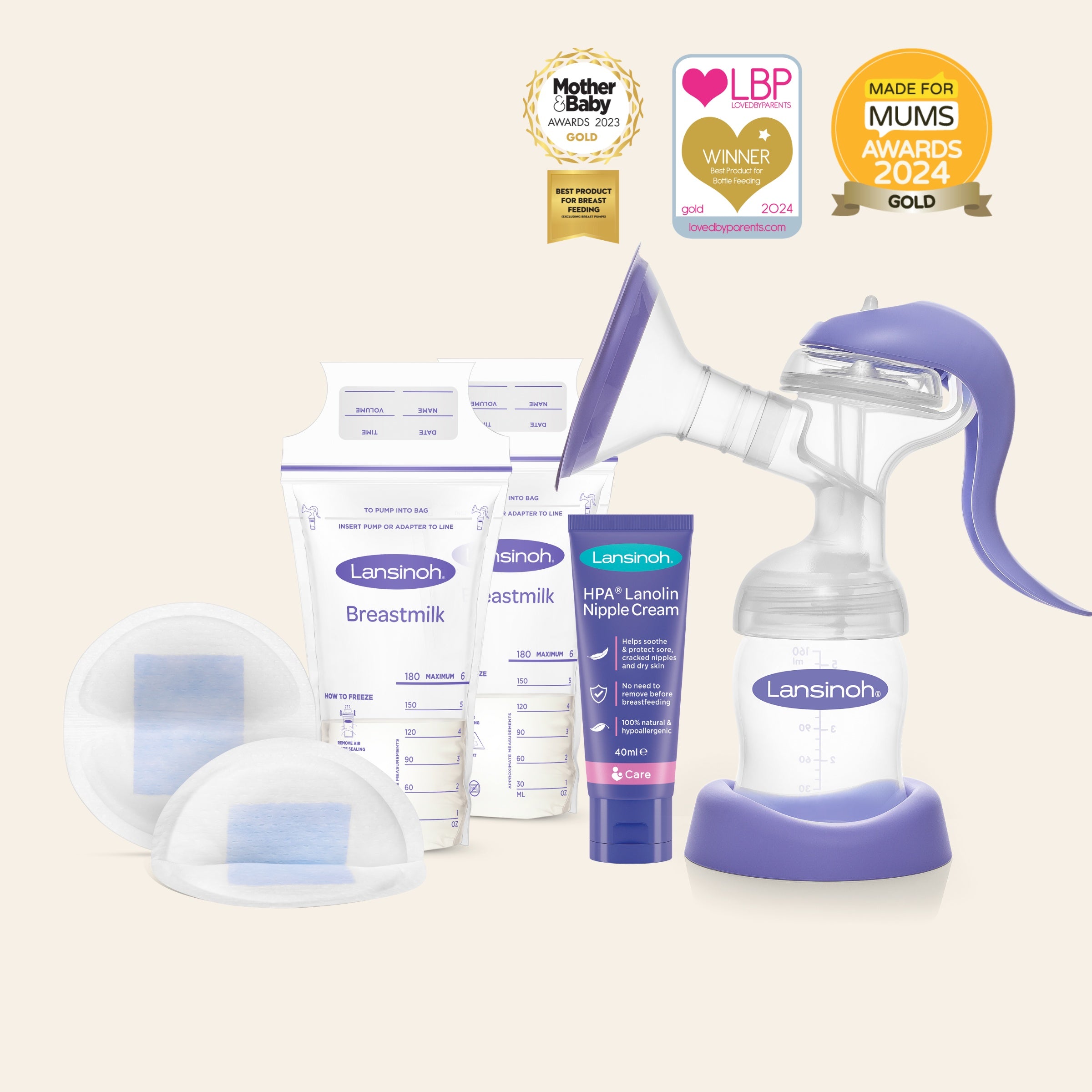 The set includes Lansinoh’s gentle and convenient Manual Breast Pump, award-winning HPA® Lanolin Nipple Cream, ultra-absorbent Disposable Breast Pads, and leak-proof Breastmilk Storage Bags.