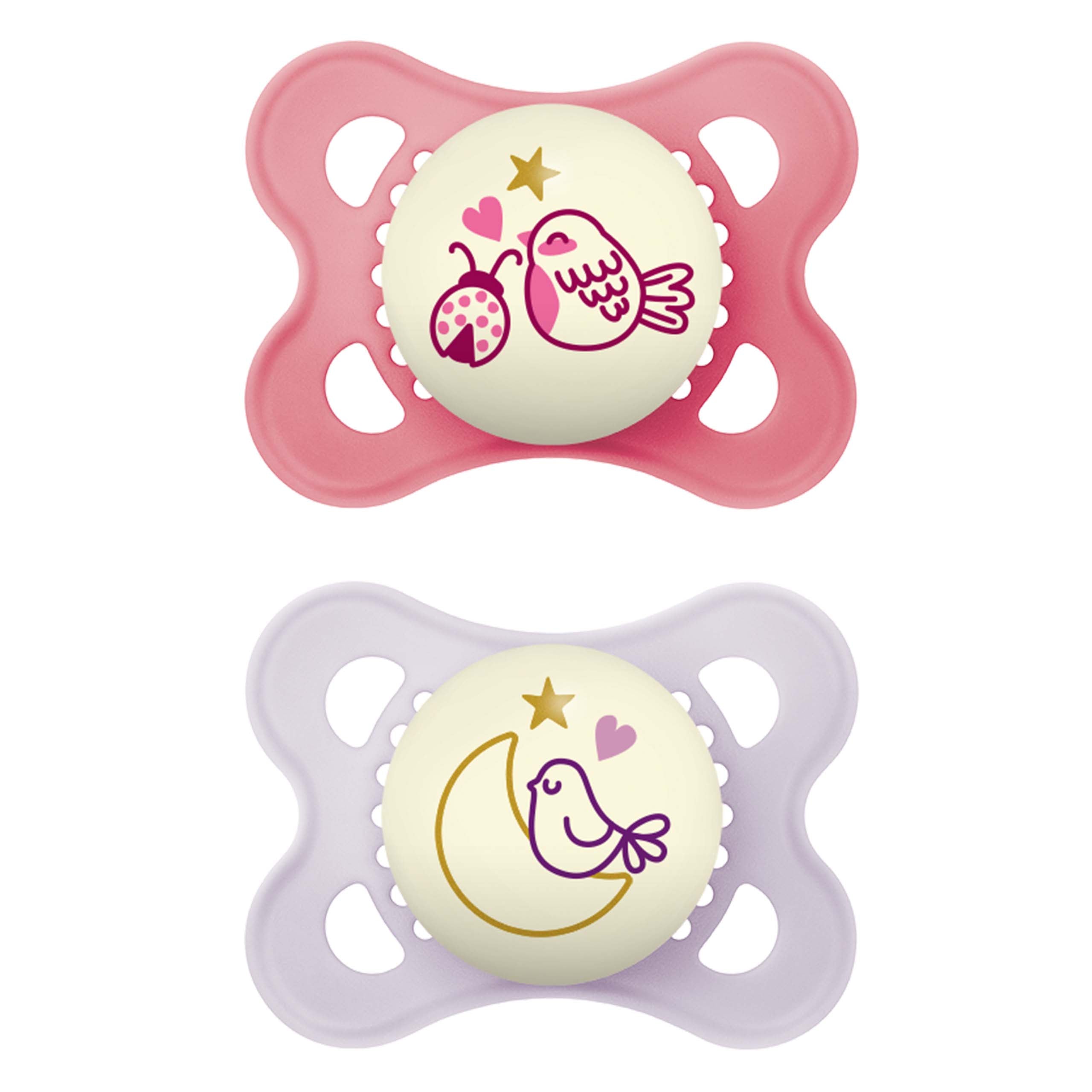 The MAM Night Soother 0-6m is made from bio-circular materials and glows in the dark. It's made from ISCC PLUS certified Circular PP, ensuring both product quality and environmental sustainability. Featuring the SkinSoft Silicone teat accepted by 94% of babies, and a flat, symmetrical shape endorsed by dentists for healthy dental development, these soothers come in a self-sterilising box for convenient and quick sterilisation in just 3 minutes in the microwave.