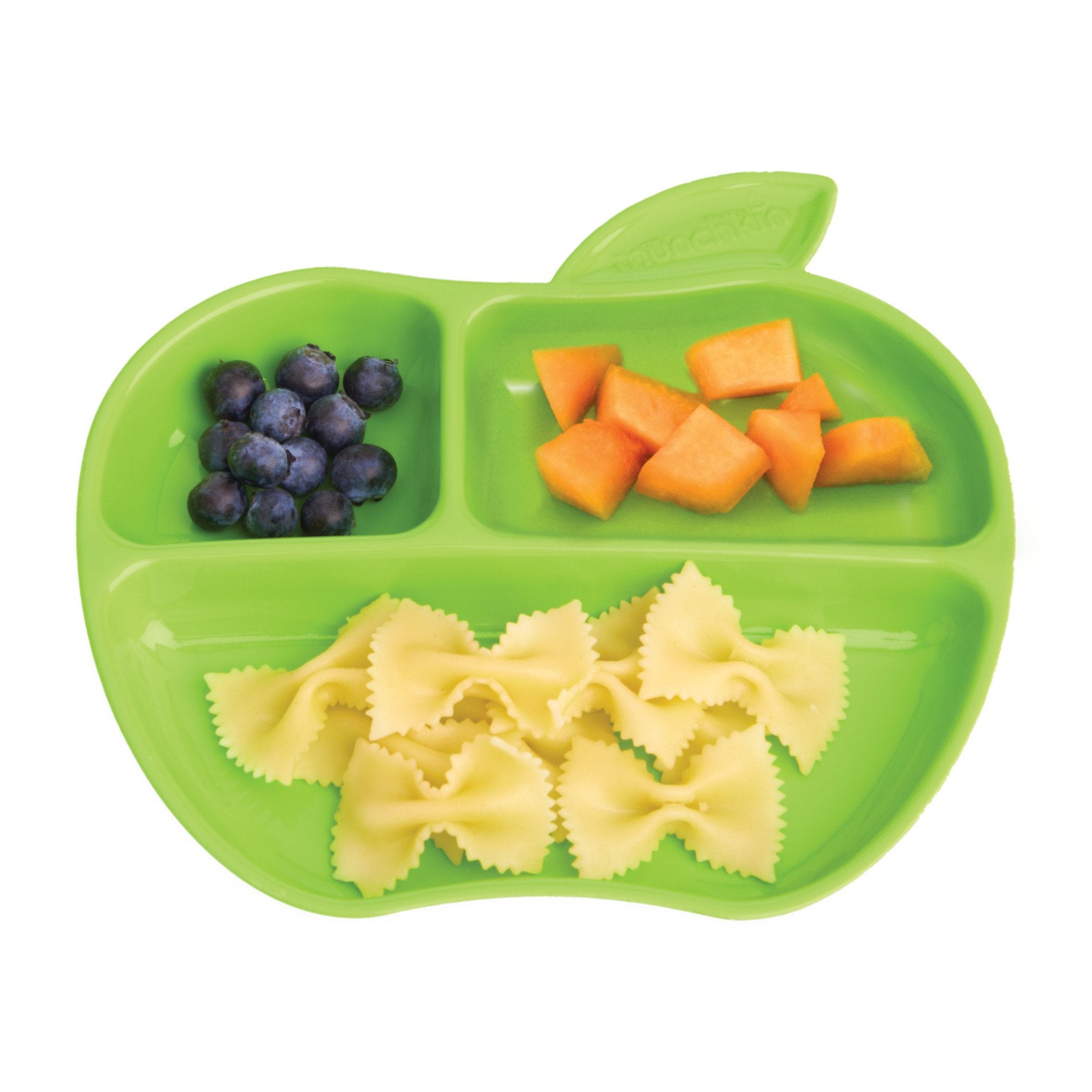 Three cute apple-shaped plates in fun colours. BPA Free. 6+m. Plates stack & store neatly. Top rack diswasher safe. Three separate sections with sloping sides for easy scooping. Multi-pack of three.