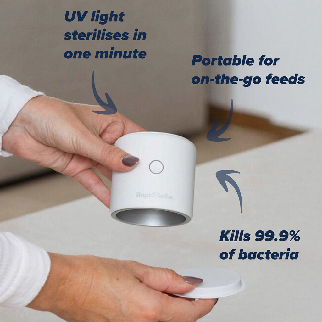 RapidSterilise is all about speed and peace of mind. No water or harsh chemicals needed, and it’s compact enough to fit seamlessly into your daily routine. Whether it’s a late-night feed or a trip out with your baby, sterilisation is quick and stress-free. Just press, sterilise, and you're good to go.