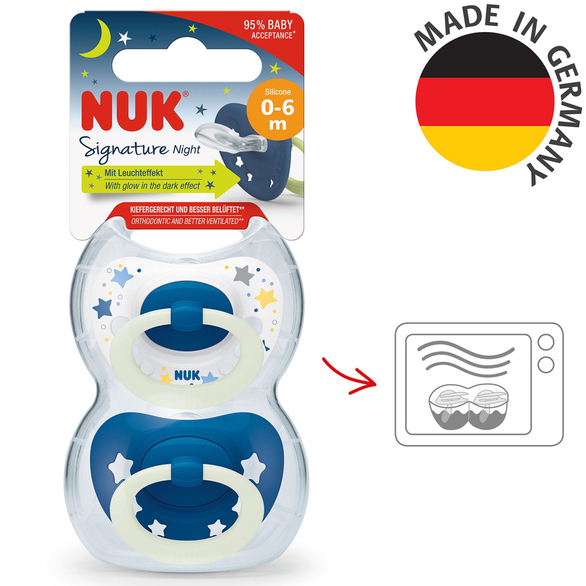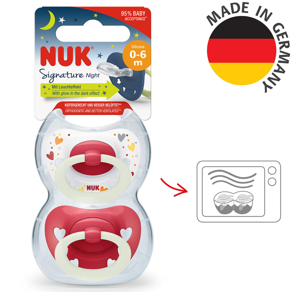 NUK Signature Night Soother 2 Pack features a heart-shaped mouth shield with star, heart, or bubble openings for a cute look. The glow-in-the-dark design makes it easy to find at night or during nap time. The improved NUK original shape is modelled on a mother’s nipple for a natural, satisfying feel. 100% of orthodontists confirm that NUK soothers do not cause crooked teeth or jaw misalignment. The NUK Air System allows air to escape, keeping the teat soft and flexible. It promotes the healthy development of teeth and jaw by exercising the lips, tongue, and facial muscles.