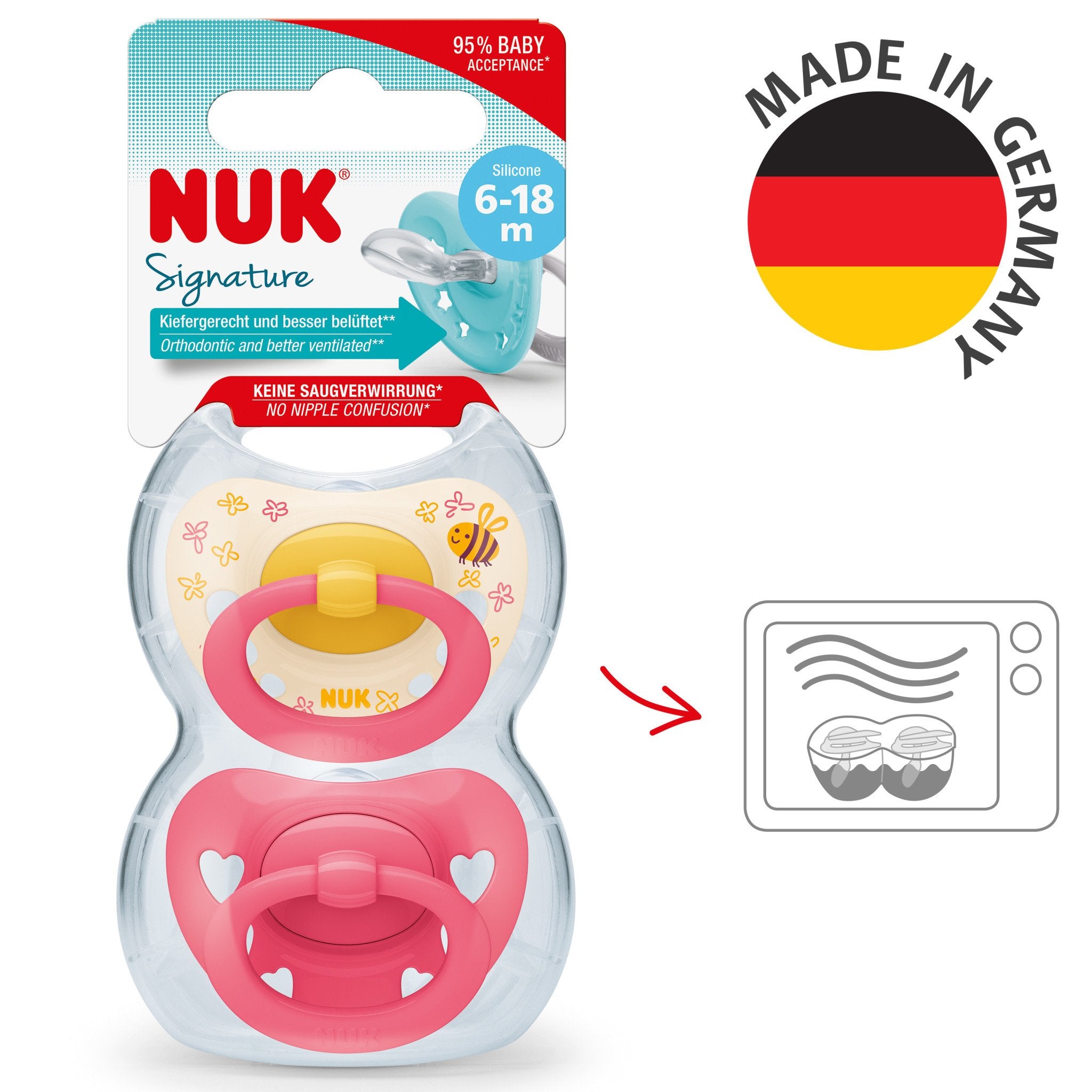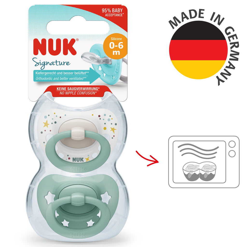 NUK Signature Silicone Soother 2 Pack features a heart-shaped shield with star, heart, or bubble openings for a cute look. The improved NUK shape is modelled on a mother’s nipple for a natural, satisfying feel. 100% of orthodontists confirm that NUK soothers do not cause crooked teeth or jaw misalignment. The NUK Air System allows air to escape, keeping the teat soft and flexible. It also promotes healthy teeth and jaw development by exercising the lips, tongue, and facial muscles.