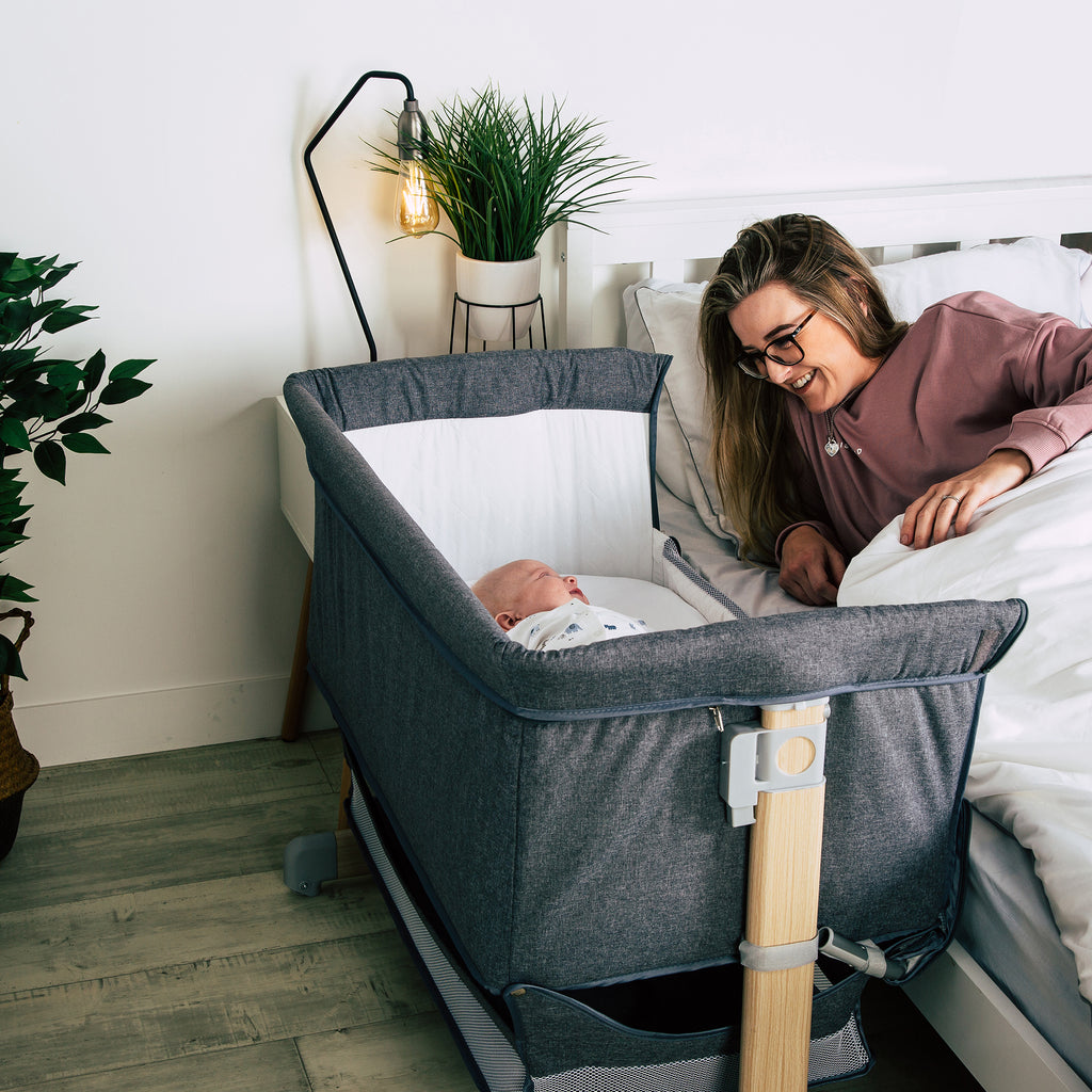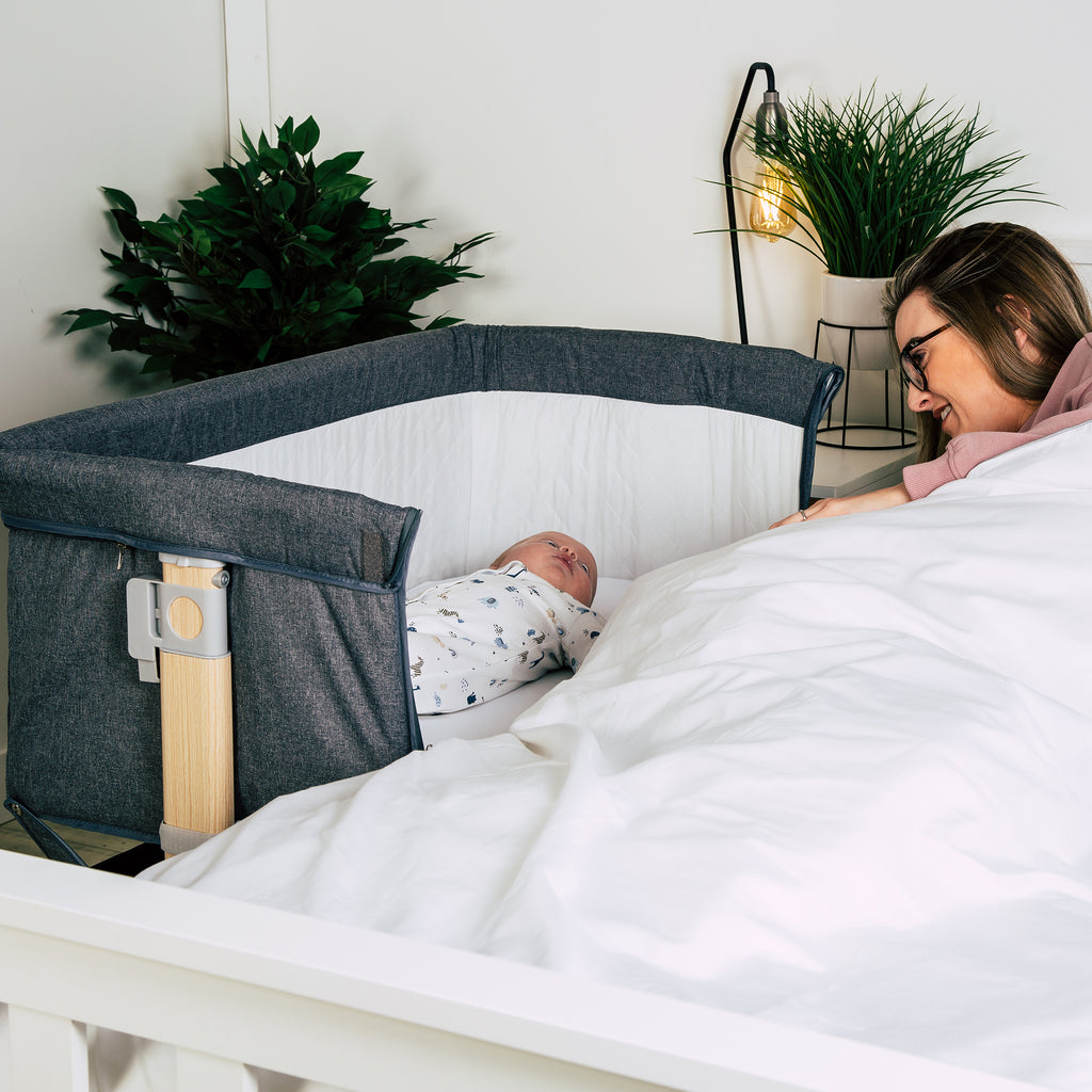 The Una Crib features drop-side functionality, enabling bedside sleeping for a strong bond with your baby and providing peace of mind knowing they are safely beside you.