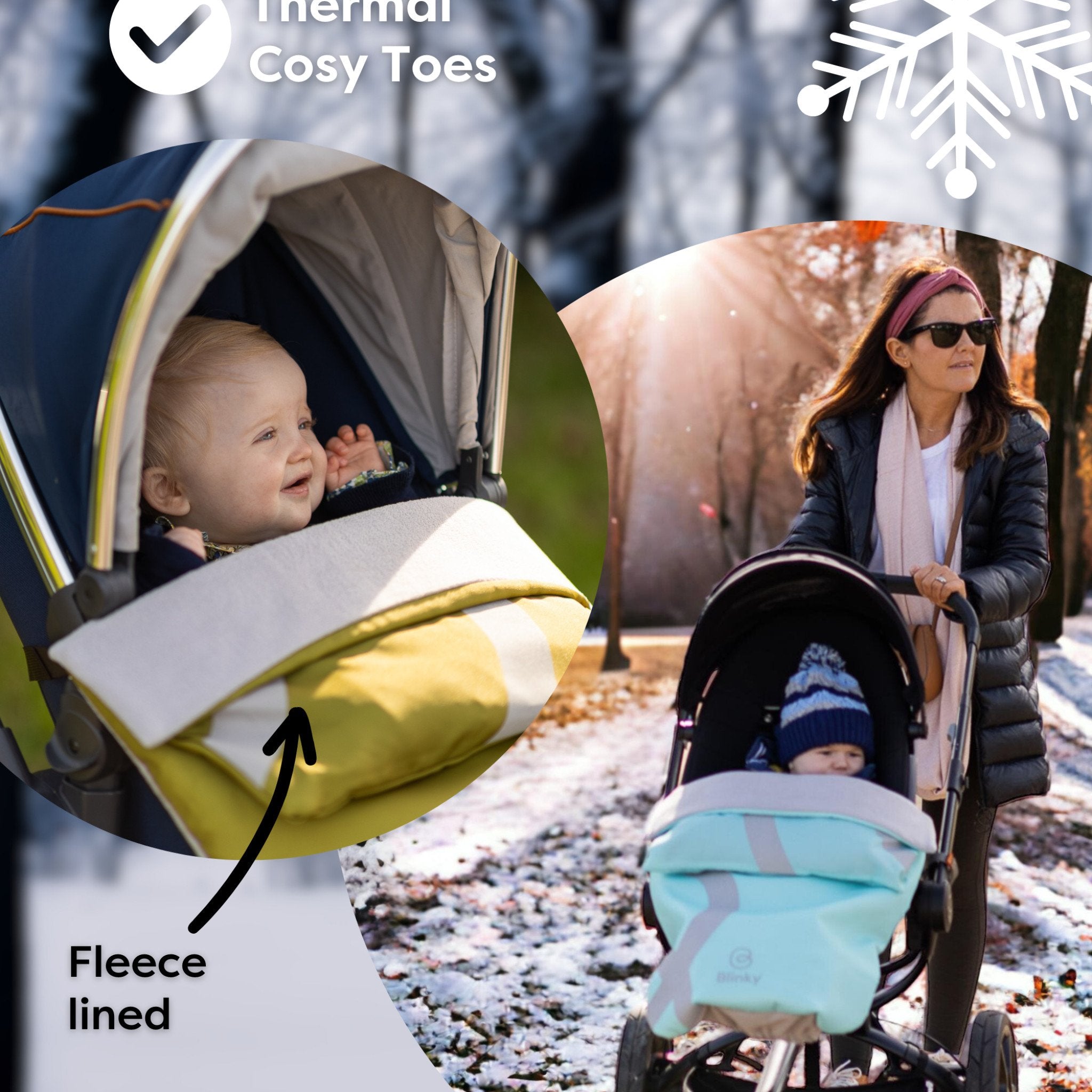 Lightweight and portable, the BlinkyWarm™ Buggy Cover folds neatly into its own integrated bag, making it easy to store and carry wherever you go. The fleece-lined, waterproof material guarantees warmth and dryness, while reflective strips enhance visibility for evening strolls, ensuring you and your child are seen during low-light conditions.