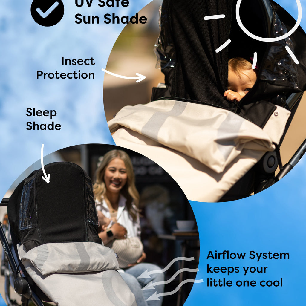 The cover features a built-in sun and sleep shade with UV 50+ protection, offering relief from the sun’s harsh rays while creating a peaceful, shaded environment for naps. In addition, the rain cover ensures your child stays dry during light showers, and the non-steam design prevents fogging, giving you clear visibility at all times. The integrated insect protection keeps bugs away, allowing your child to enjoy the outdoors worry-free. An advanced airflow system ensures continuous air circulation when the shades are in use, keeping your child cool and comfortable even on warmer days.